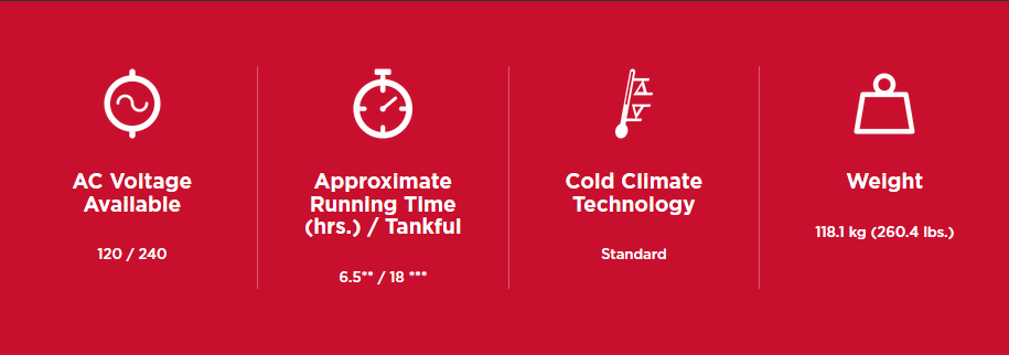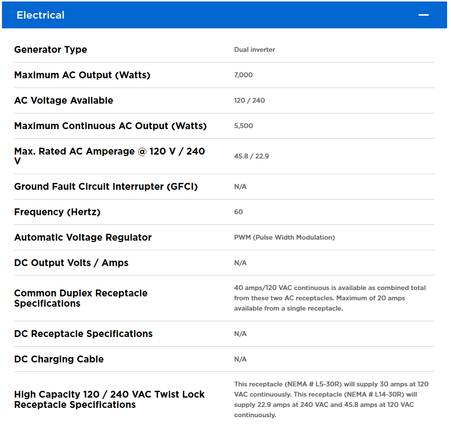 - 7,000 Watts (45.8/22.9 A) 120/240 VAC of Honda inverter power