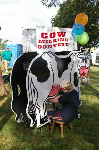 The Cow Milking Contest Game Rental is loads of fun for everyone. Take turns milking a cow timed with a stop watch. Whoever gets the most milk (water with white coloring) into the bucket wins. The Cow Milking Contest Game Rental is sure to get everyone laughing.