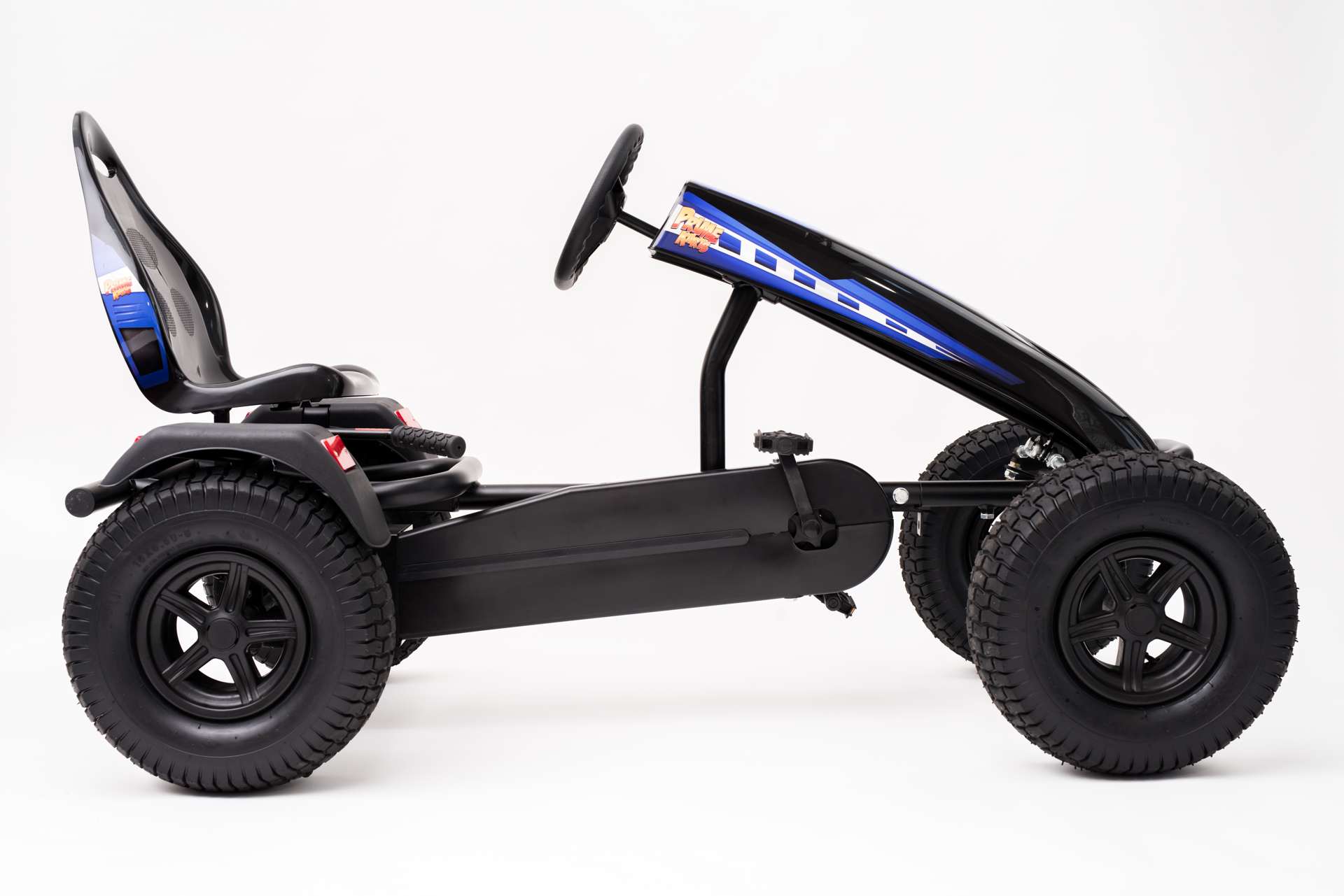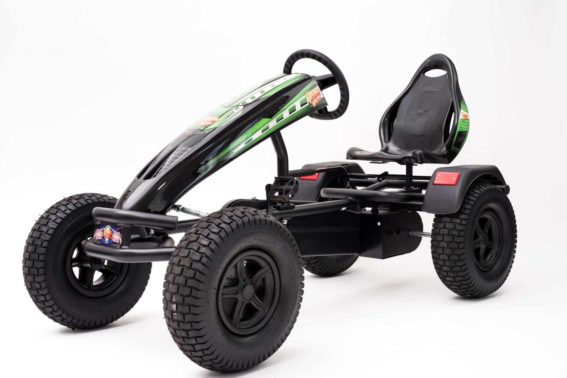 The biggest, baddest kart built for riders aged seven and older. Solid and sturdy, this kart keeps a firm stance on rougher terrain with its articulated front end and four big, air-filled tires. The six-position seat accommodates larger children and adults all the way up to 350 pounds.