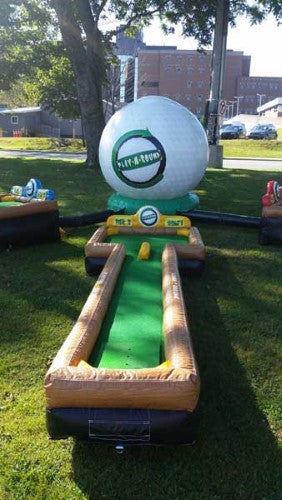 Play A Round Golf takes Mini Golf to the next level. This smaller version of our 9 hole mini golf features 3 holes of varying designs and levels of difficulty. Unlike other inflatable mini golf courses, this inflatable is designed for patrons to walk around the putting surface, preventing their movements from disturbing the ball.