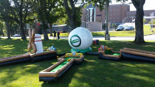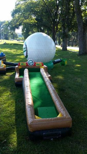 This inflatable mini golf course comes to your home and provides fun for all ages. It has 9 holes of different designs and levels of difficulty to choose from! Great for any event. Includes golf clubs, golf balls and score cards.