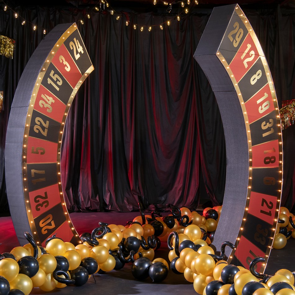 This freestanding, 3D cardboard entrance has the look of a roulette wheel printed on one side and lights up with the included string lights.