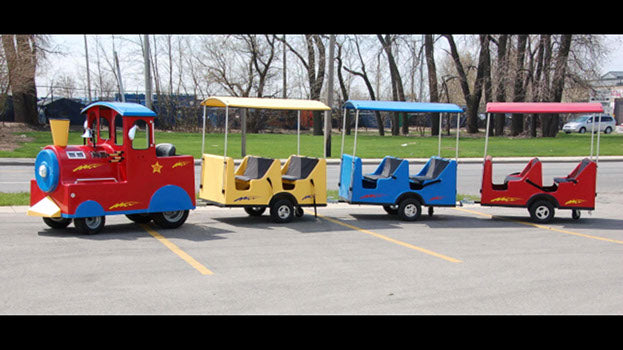 This trackless train is equipped with a beautiful red engine and up to 4 cars. The engine has a headlight and authentic sounding bell and horn. Each car has a removable roof and can hold up to 6 people per car.
