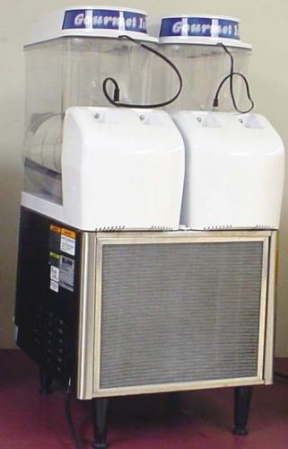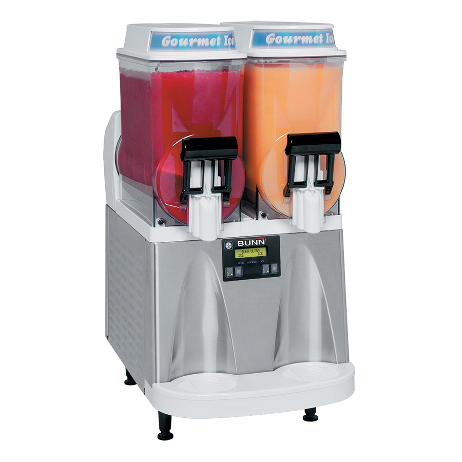 This frozen drink system provides 26 servings per hour. The patented reversing auger design reduces freeze time and air mixing with product. An easy-to-use touchpad is readily accessible on the front of the machine. Two large 3 gallon hoppers are included.