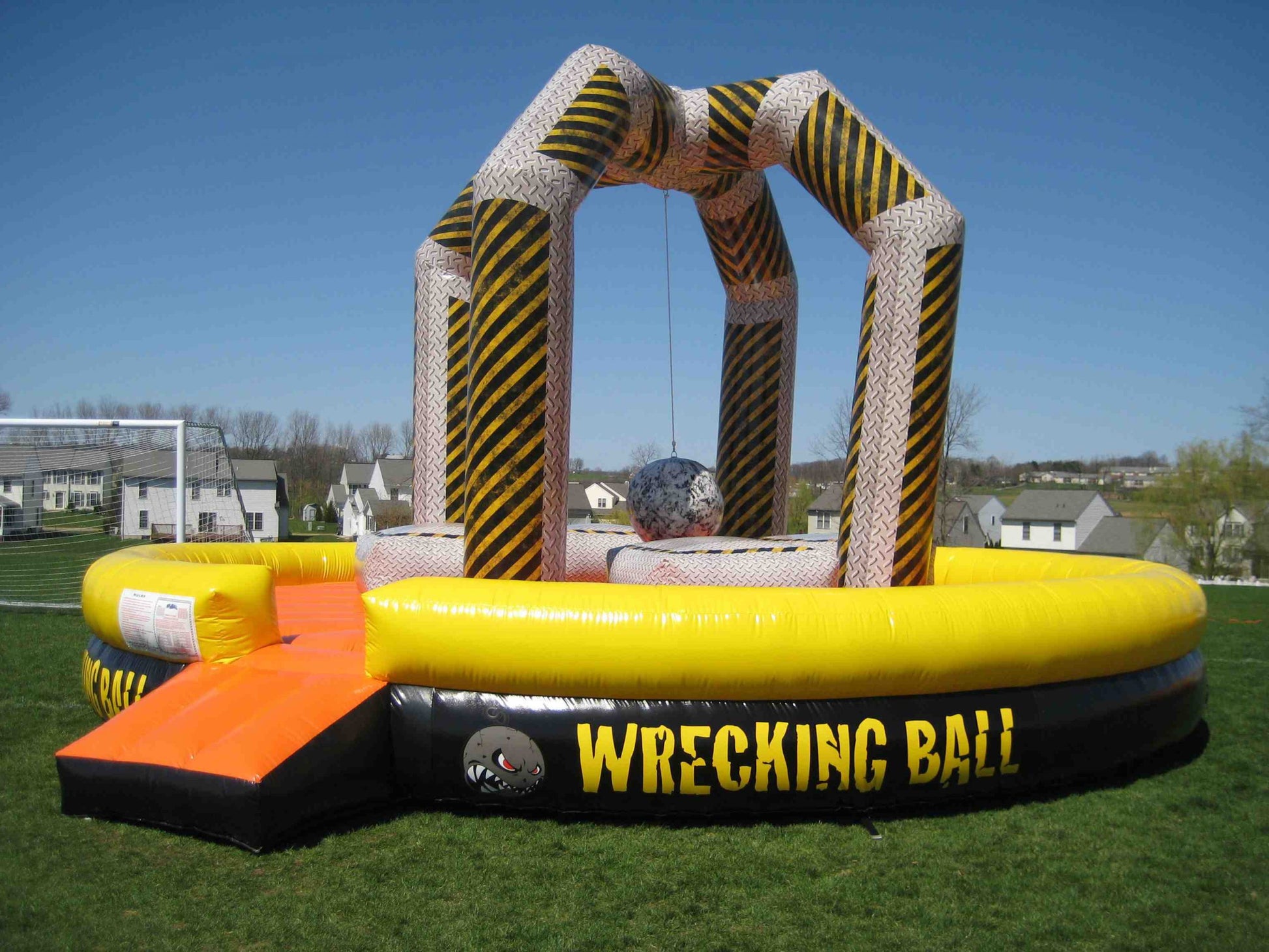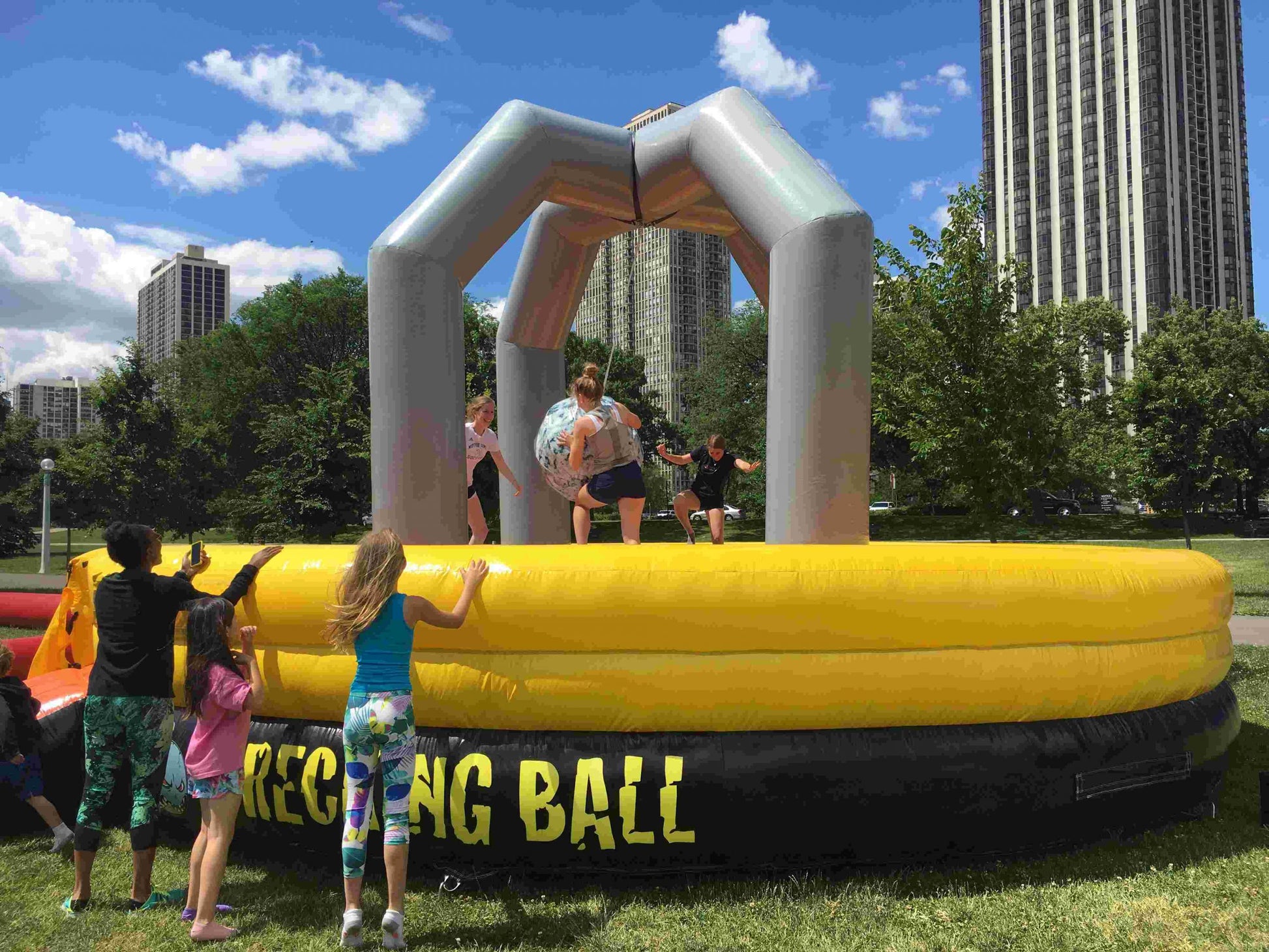 Try not to laugh! Players try to stay atop of their inflated pads, one of the players grabs the Wrecking Ball and hurls it at their opponent in an attempt to knock the player off of their inflated pad. As the wrecking ball swings back, try and grab it! The player who grabs it first can hurls it at another player! The last player standing is the champion.